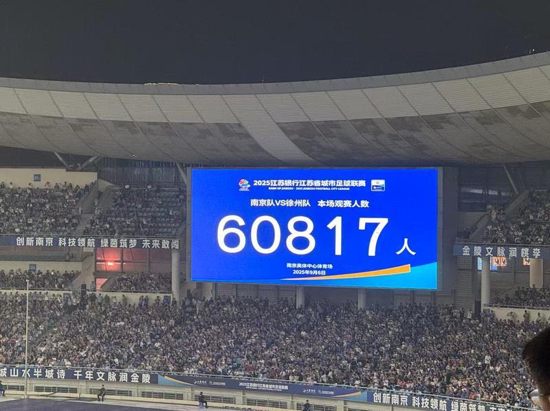 9月6日晚,在正在进行的苏超第11轮南京队对阵徐州队的焦点战中,南京奥林匹克体育中心,“苏超”单场上座率再创新高!经官方最终统计,本场比赛共吸引60817名球迷入场观战,山呼海啸般的助威声席卷全场。